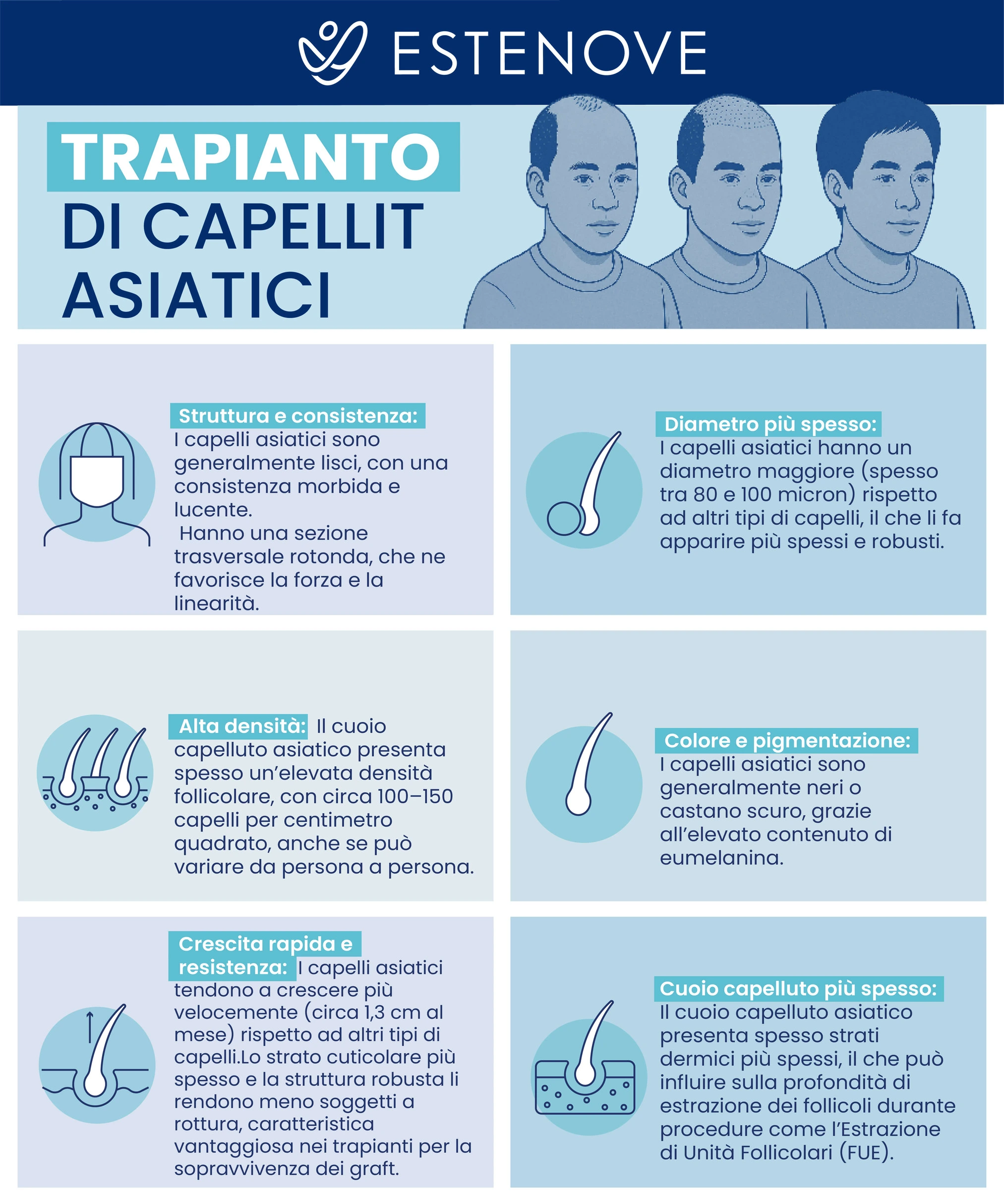 Sì, ma con una pianificazione speciale. La struttura del cuoio capelluto asiatico, lo spessore dell’innesto e la densità inferiore richiedono approcci personalizzati. Presso Estenove:
